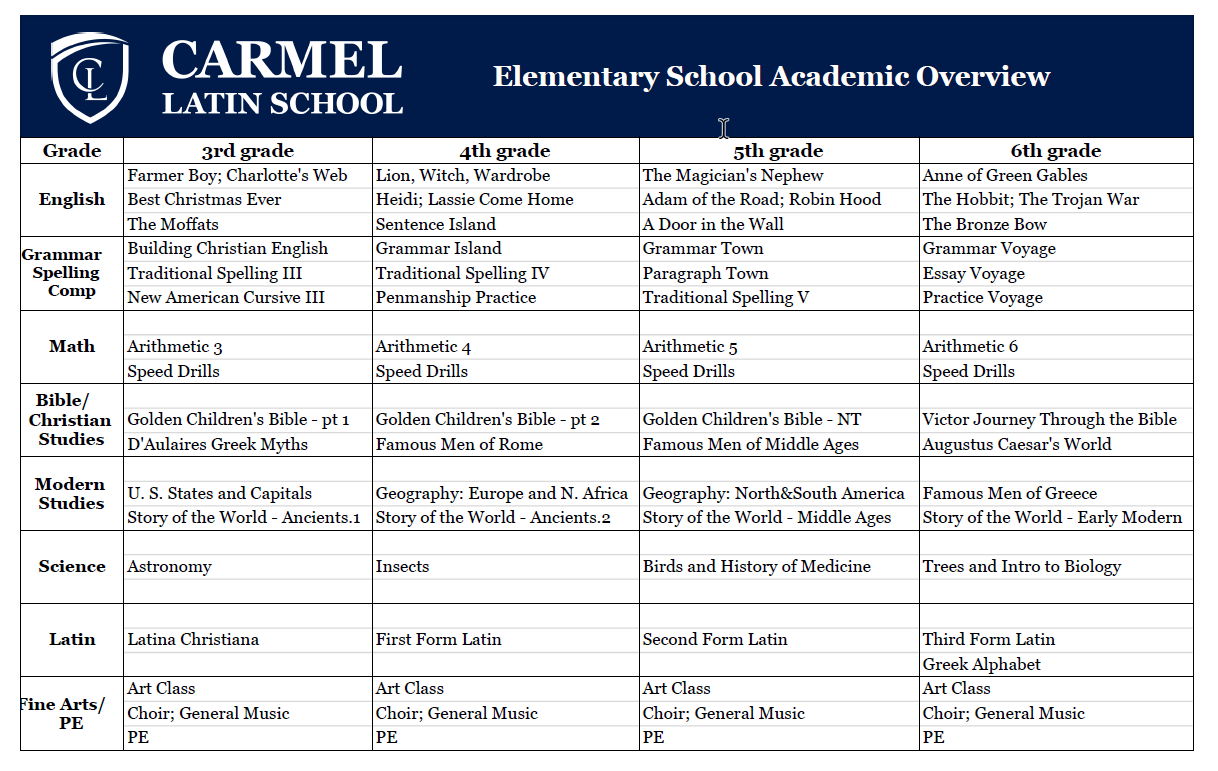 New students beginning their classical education in 6th grade assimilate well into our program. Latin courses are available for beginning, intermediate and advanced levels. The review and content embedded in the sixth grade curriculum make this year a solid entry point for new students to be successful at Carmel Latin School.